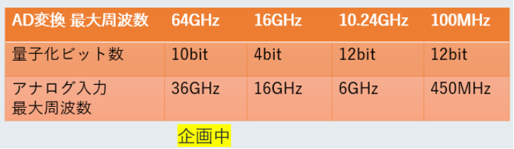 ご発注時にいずれか1つもしくは複数を選択し、括弧内のパラメータはご相談。 ・デジタル分光処理(FFT周波数間隔/積分時間/出力形式) ・デジタルビームフォーミング(ビーム数/FFT周波数間隔/積分時間/出力形式) ・デジタル周波数変換+イメージ除去+再量子化(NCO周波数分解能/NCO位相分解能/積分時間/再量子化ビット数/出力形式) ・相関処理(FFT周波数間隔/積分時間/出力形式) |